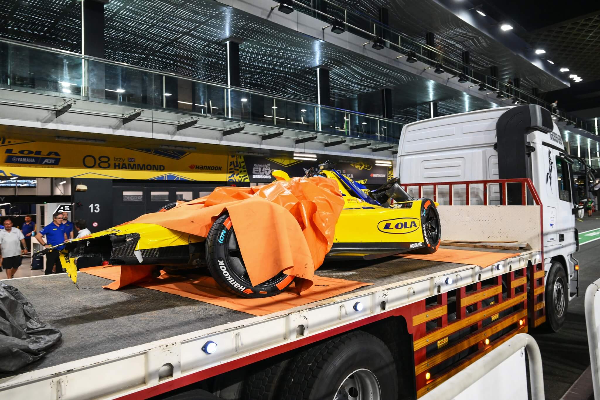 Das Ganze passierte dabei nicht auf einer Rennstrecke mit großen Auslaufzonen, sondern zwischen den engen Betonmauern von Jeddah, wo am Vortag noch die 20 Fahrer der Rennserie ihr Rennen ausgetragen hatten. Das Ergebnis: Es gab mehrere Unfälle, darunter sogar einen äußerst schweren. Glücklicherweise überstand Izzy Hammond den Crash im Lola Yamaha ABT, den sonst Zane Maloney fährt, unverletzt. Bei dem Einschlag mit hoher Geschwindigkeit sollen Kräfte von etwa 24 g auf Hammond gewirkt haben.