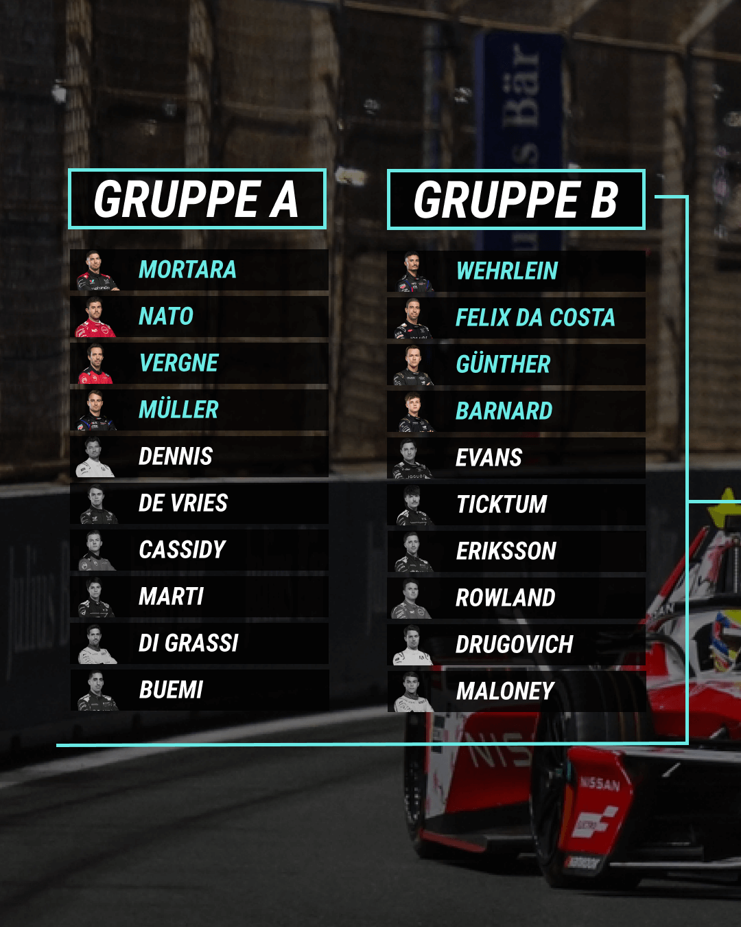 In Gruppe B kämpften Pascal Wehrlein, Oliver Rowland, Mitch Evans, Joel Eriksson, Taylor Barnard, Maximilian Günther, Antonio Felix da Costa, Zane Maloney, Felipe Drugovich und Dan Ticktum um das Weiterkommen in die Duelle.