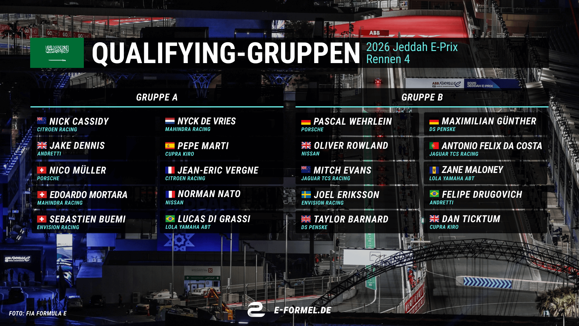 Der Jeddah E-Prix ist ein "Double-Header", es werden also zwei Rennen in Saudi-Arabien ausgetragen. Die Rennen finden am Freitag, den 13. Februar und am Samstag, den 14. Februar 2026 statt.