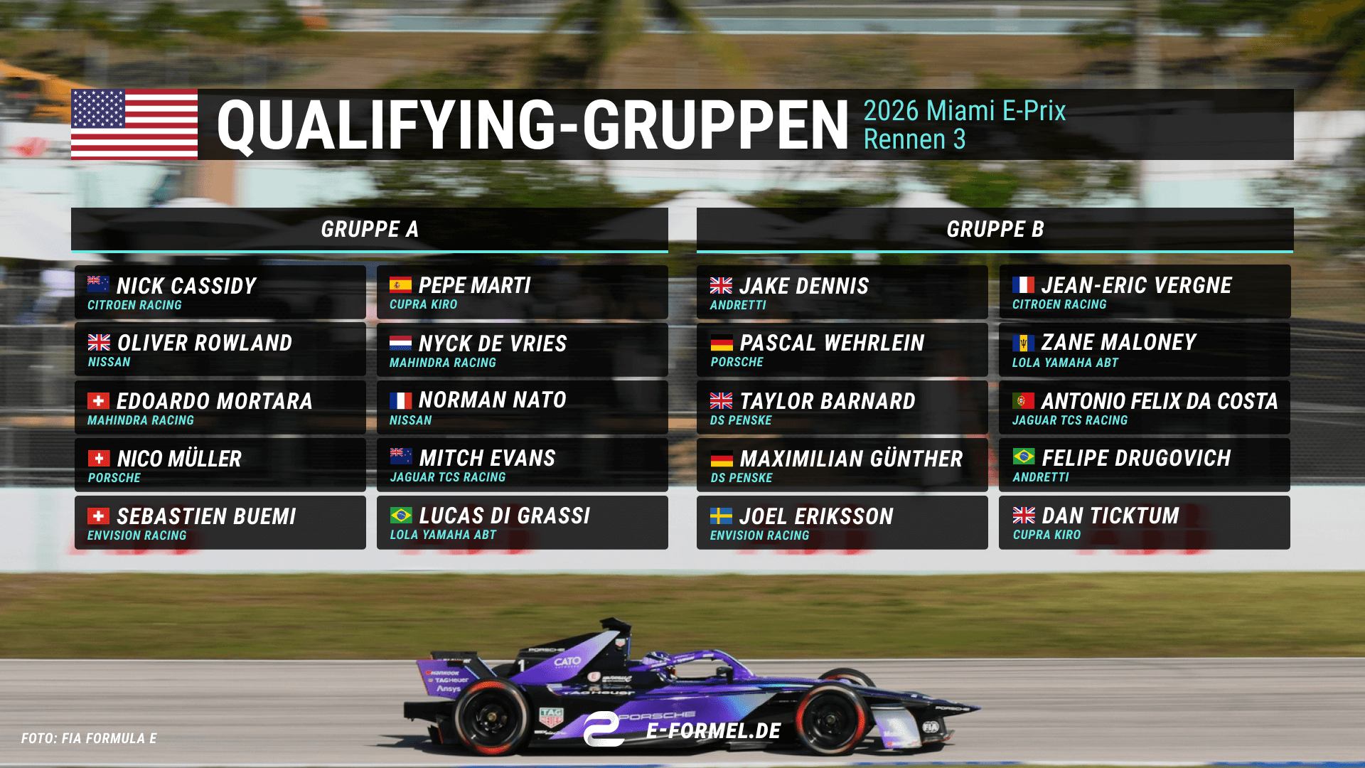 Im zweiten Rennen der zwölften Formel-E-Saison in Mexiko-Stadt zeigte Nick Cassidy die Dominanz von Citroen und übernahm die Führung in der Meisterschaft. Er geht als Favorit in das Rennen in Miami. Doch auch der amtierende Weltmeister Oliver Rowland (Nissan) aus Großbritannien und sein Landsmann Jake Dennis (Andretti) reisen mit Siegchancen an. Alle bringen das perfekte Gesamtpaket mit in die Küstenstadt Floridas.