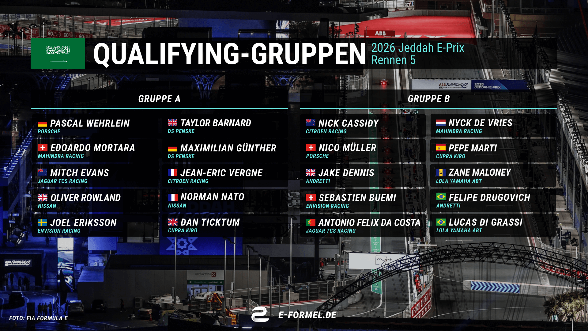 Das zweite Rennen vom Jeddah-Doubleheader steht an! Die Poleposition sicherte sich gestern ein bärenstarker Edoardo Mortara. Nach schlechtem Start wurde er schlussendlich nur Zweiter hinter Pascal Wehrlein und vor Mitch Evans. Das komplette Podest von Rennen 1 startet heute in Gruppe A! In Gruppe B wollen besonders Jake Dennis, Nyck de Vries und Nick Cassidy heute wieder in die Duelle einziehen, nachdem sie es gestern knapp verpassten.